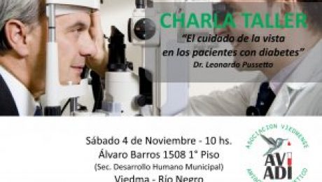 En el marco del programa educativo comunitario en diabetes 2017, este sábado 4 de noviembre, la Asociación Viedmense Amigos del Diabético (A.V.I.A.D.I) brindará una charla informativa sobre “El cuidado de la vista en los pacientes con diabetes”. Esta jornada estará a cargo del Dr. Leonardo Pussetto.e iniciará a las 10, en la Secretaría de Desarrollo Humano