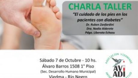 En el marco del programa educativo comunitario en diabetes 2017, mañana sábado 7 de octubre, la Asociación Viedmense Amigos del Diabético (A.V.I.A.D.I) brindará una charla informativa sobre “El cuidado de los pies en los pacientes con diabetes”. Esta jornada estará a cargo del Dr. Ruber Zamfardini, la Dra. Nadia Alderete y la Pdga. Liberata Echazui,