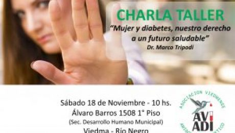 Mañana, sábado 18 de noviembre, la Asociación Viedmense Amigos del Diabético (A.Vi.A.Di) realizará una charla taller relacionada con la campaña del Día Mundial de la Diabetes: “Mujer y diabetes, nuestro derecho a un futuro saludable”, a cargo del Dr. Marco Tripodi. La charla forma parte del programa educativo comunitario en diabetes 2017, y se llevará a
