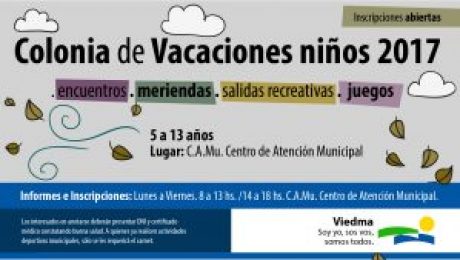 Ya se encuentran abiertas las inscripciones para participar de la Colonia de Vacaciones de Invierno para niños, en el Centro de Atención Municipal (C.A.Mu), ubicado en calle Maizani del barrio Lavalle. Las inscripciones podrán realizarse en el C.A.Mu, en el horario de 8 a 13 y de 14 a 18, con fotocopia de DNI. En